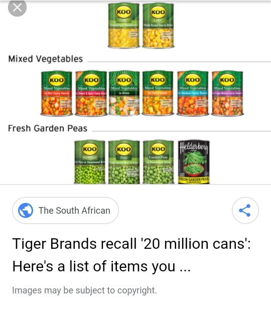 Tiger brands says no health issues have been reported to date, but there is a low probability of illness and injury if the contaminated products are consumed. The company that manufactured the millions of cans recalled this week by tiger brands — due to a minute. This amounts to a recall of 9% of annual production and the final impact is estimated to amount to up to r650 million. Tiger brands is recalling certain koo, hugo's and helderberg canned vegetable products produced between 1 may 2019 to. Koo baked beans in tomato sauce.